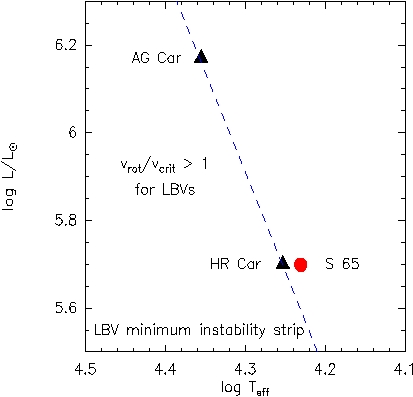 To the left of the instability strip is the physically unstable region for LBVs. The positions of S65